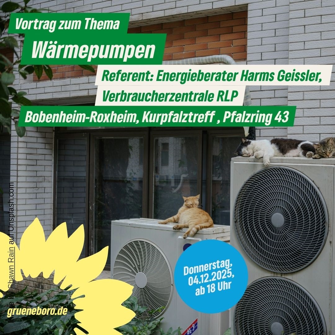 04.12.2025 - Der Ortsverein Bündnis 90 Die Grünen lädt zum Vortrag „Wärmepumpen“ der Verbraucherzentrale RLP in den Kurpfalztreff, Pfalzring 43, ein.