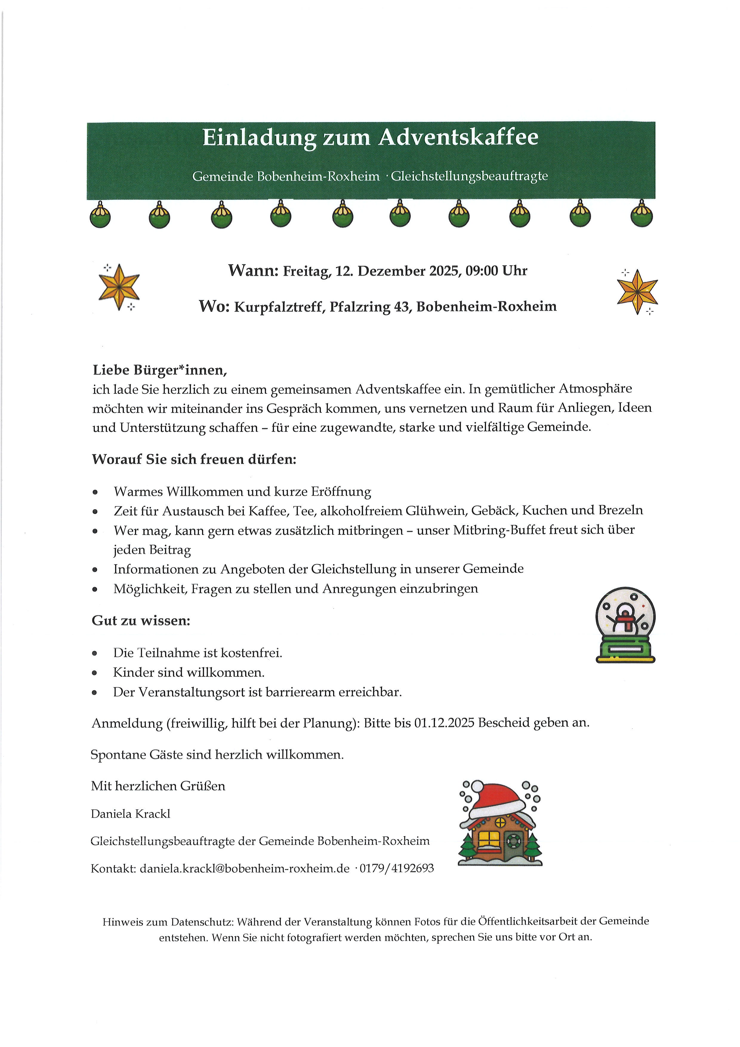 12.12.2025 - Die Gleichstellungsbeauftragte der Gemeindeverwaltung Bobenheim-Roxheim lädt zum Adventskaffee in den Kurpfalztreff ein!