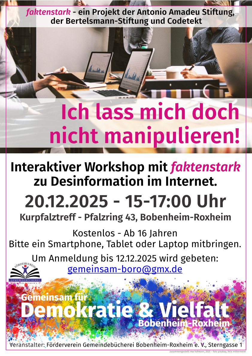 20.12.2025 - Der Förderverein Gemeindebücherei und Gemeinsam für Demokratie und Vielfalt laden zum Workshop "Desinformation im Internet" in den Kurpfalztreff ein.