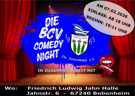 07.02.2026 - Der Bobenheimer Carneval Verein "Die Zellerieköpp" 1965 e.V. lädt zur Comedy Night in die Friedrich-Ludwig-Jahn Halle ein. Beginn: 19.11. Uhr