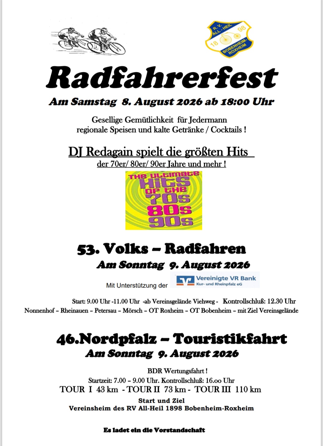 09.08.2026 - Der Radfahrerverein ALL HEIL lädt zur Touristikfahrt und zum Volksradfahren ein. Treffpunkt: Vereinsgelände, Viehweg 2; Beginn: 7.00 Uhr