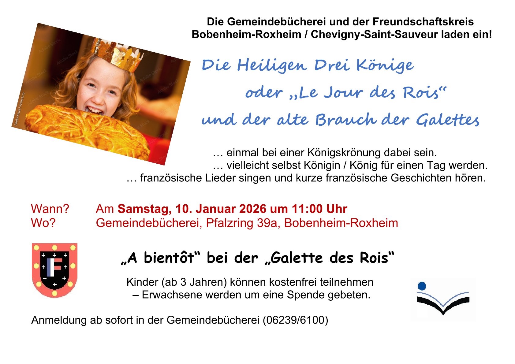 10.01.2026 - Der Freundschaftskreis Bobenheim-Roxheim Chevigny-Saint-Sauveur lädt zusammen mit der Gemeindebücherei zu "Die Hl. drei Könige oder Le Jour des Rois und der alte Brauch der Galettes - wer wird König(in)? in die Gemeindebücherei ein.