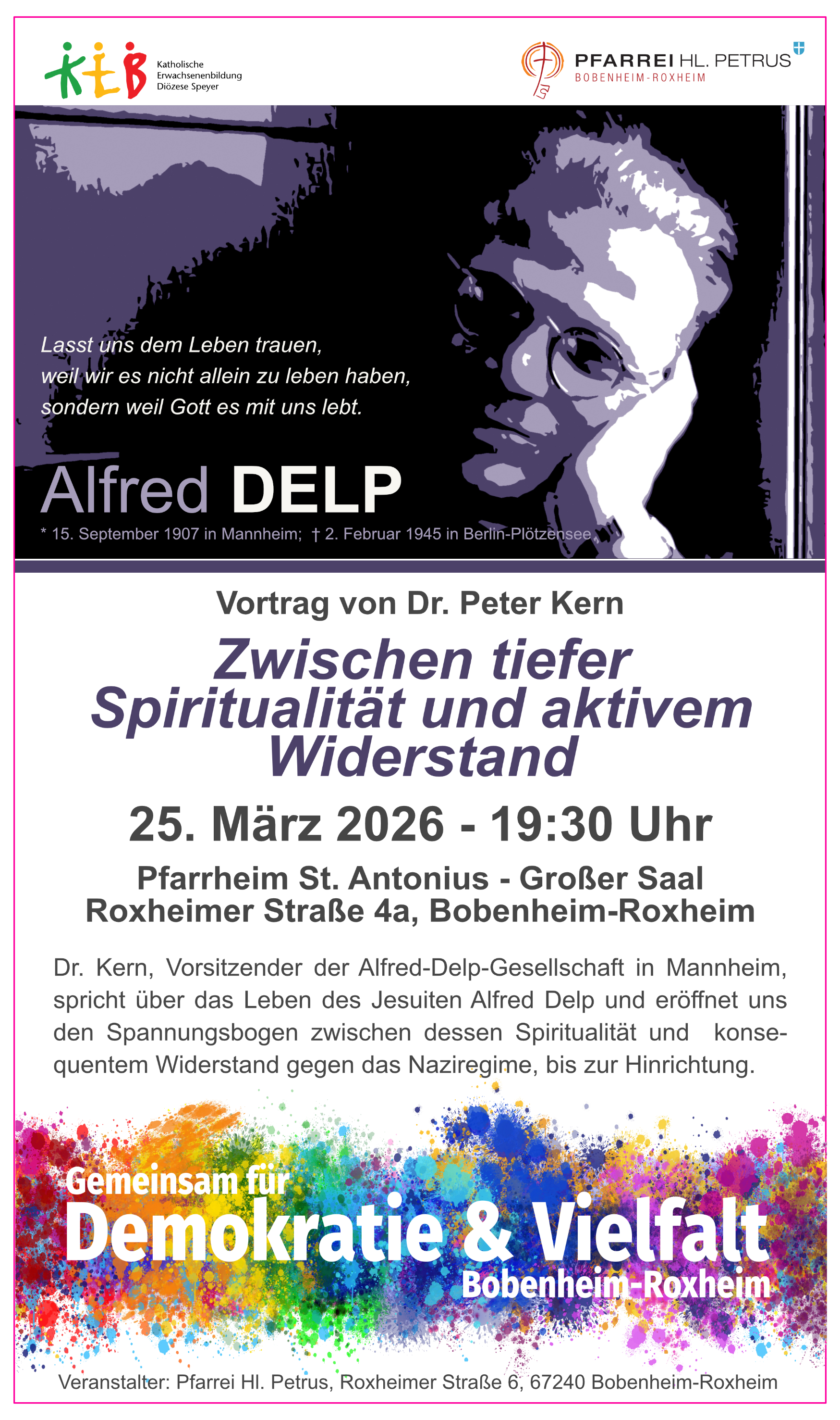 Das Bündnis "Gemeinsam für Demokratie und Vielfalt" lädt zu einem Vortrag zu Alfred Delp - Jesuit und Widerstandskämpfe in den großen Saal des Kat. Pfarrheims St. Antoniusheimes ein.